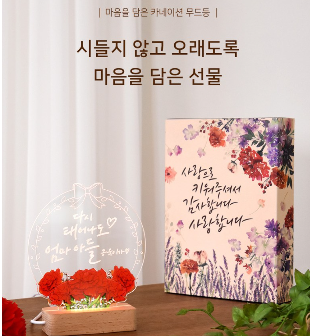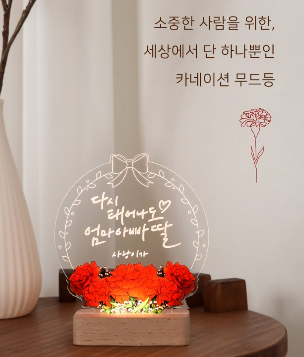 카네이션 무드등은 카네이션을 선물하면서 무드등이 주는 분위기까지, 나만의 문구로 특별함까지 선물할 수 있습니다.