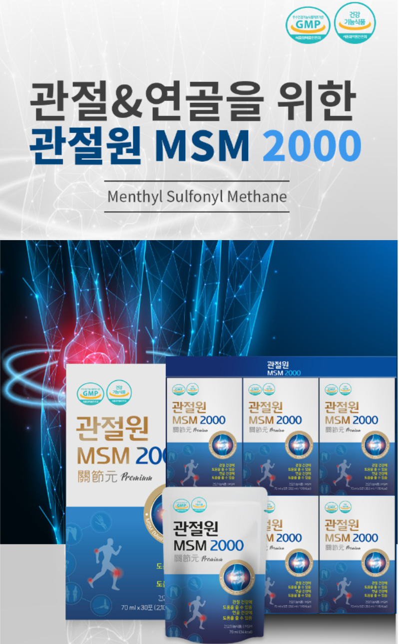 흡수가 빠른 마시는 식이유황 MSM입니다. 나이가 들수록 관절은 약해집니다. 그래서 무릎 통증을 호소하시는 부모님들이 많으신데요 MSM은 관절과 연골에 좋은 건강식품입니다. 그리고 아직 젊은 분들도 관절 건강을 위해 미리 드시는 것도 좋습니다. 2,000mg으로 함량이 높고 건강기능식품 인증을 받은 제품입니다. 박스포장으로 선물용으로 좋습니다.